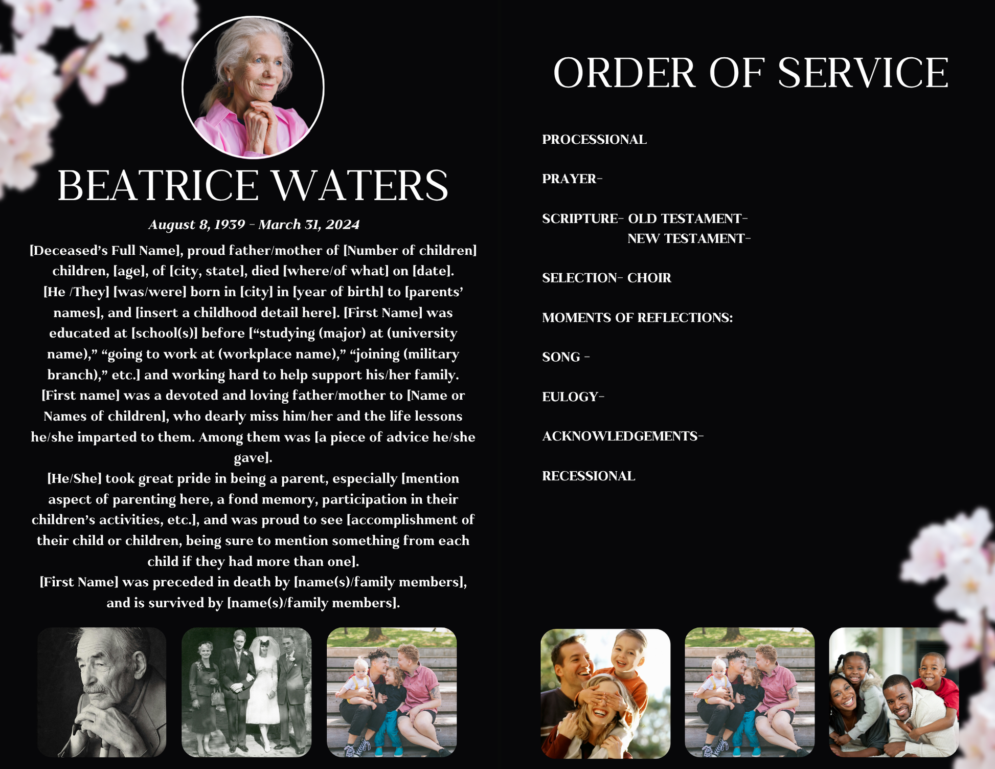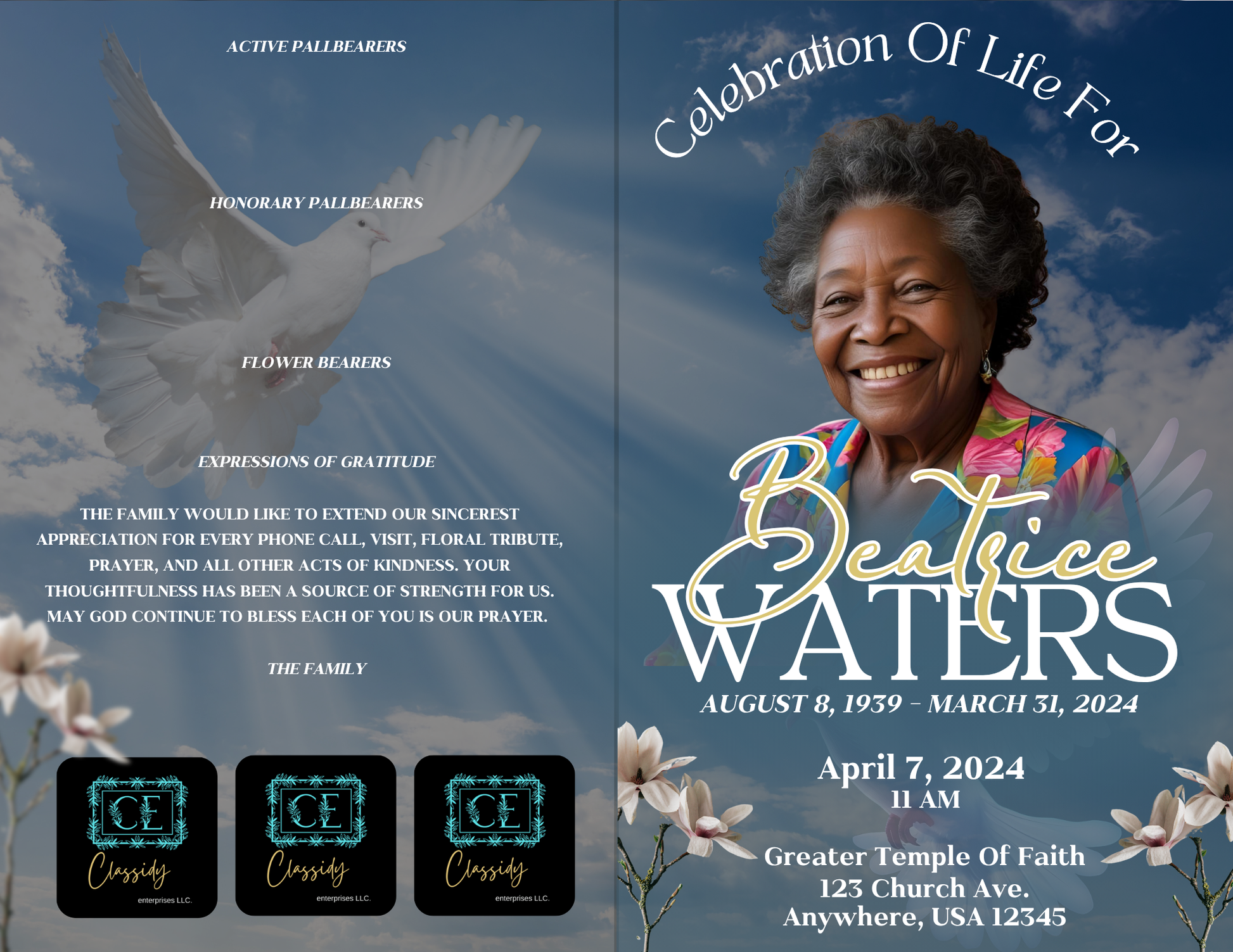 Our Obituaries service offers a compassionate way to honor and remember your loved ones. Crafted with care and sensitivity, each obituary highlights the unique life and legacy of the individual, providing comfort and connection during difficult times. This thoughtful tribute helps share memories and celebrate a life well-lived with family and friends.